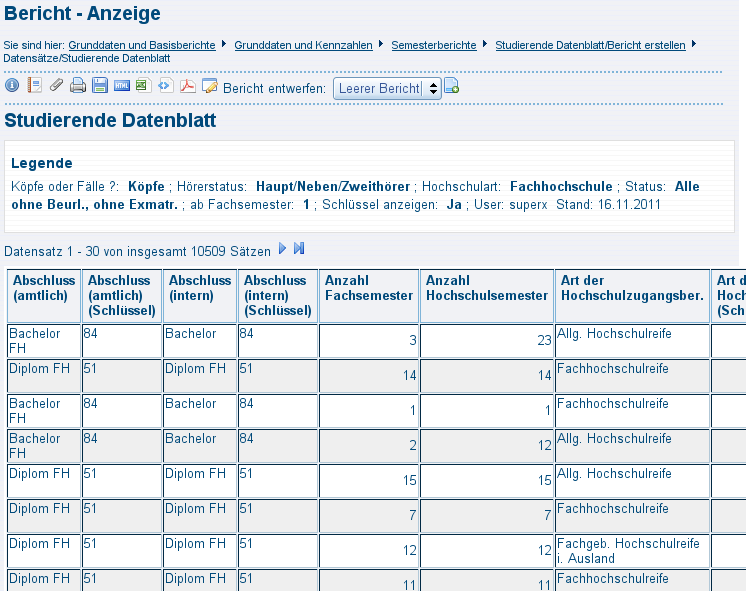 In der Ergebnistabelle wird als Überschrift der jeweiligen Spalte die Spaltenbeschreibung genommen und nicht der Feldname der Tabelle aus der Datenbank. In diesem Beispiel wurde die Option "Schlüssel anzeigen" genutzt. Daher werden für "Abschluss (amtlich)" 2 Spalten angegeben. Die erste Spalte ist der zugehörige Text zu der Zahl (Schlüssel) aus der 2. Spalte. Die Schlüssel sind mit dem Text "(Schlüssel)" in der Spaltenüberschrift versehen. Es wird immer zuerst der aufgeschlüsselte Text angegeben und die darauf folgende Spalte ist dann der Schlüssel. Spalten wie "Anzahl Fachsemester" (s.o. in der Beispielergebnistabelle) haben keinen Schlüssel und somit auch keine Aufschlüsselung.