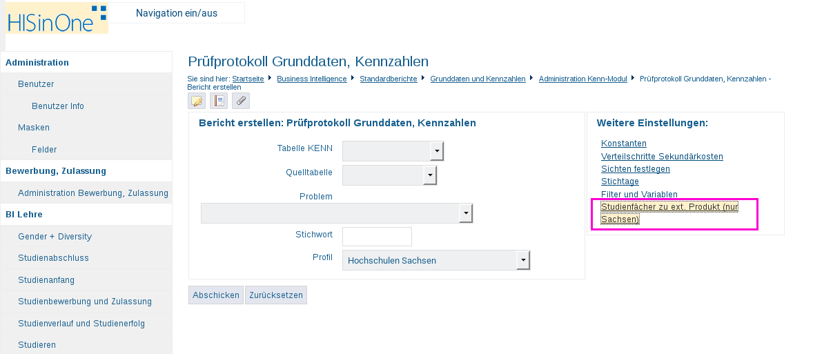 Fast alle Anpassungen lassen sich browserbasiert im XML-Frontend vornehmen, öffnen Sie dazu die Maske Prüfprotokoll Grunddaten und Kennzahlen: