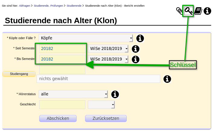 Die Werte für die Felder "Seit Semester" und "Bis Semester" sind also 20182, der Code fürs WiSe 2018/2019.