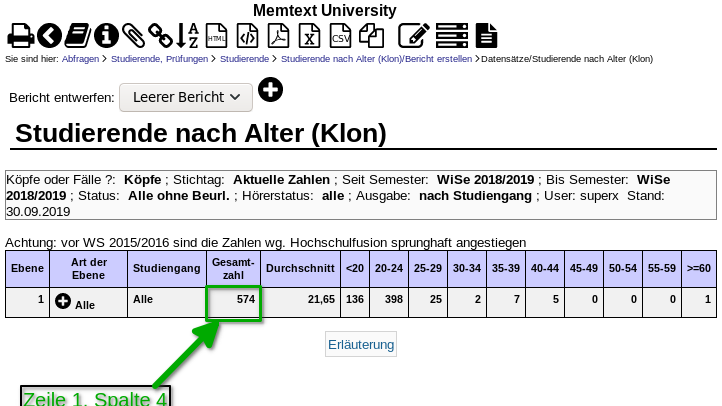 Die Maske führen wir für das WiSe 2018/2019 aus. Im Ergebnis erhalten wir 574 Studierende gesamt. Wir notieren die Zeilen und Spaltennummer der Ergebnisses, das wir absichern wollen.