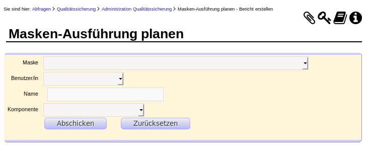 Wir legen den Testfall an, indem wir in die Maske Qualitätssicherung -> Administration Qualitätssicherung -> Masken-Ausführung planen gehen. Dort können wir filtern auf Merkmale eines Testfalls, z.B. die zugehörige Maske, die Komponente oder den Namen des Testfalls.