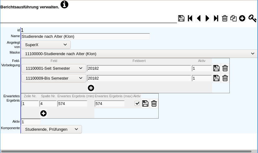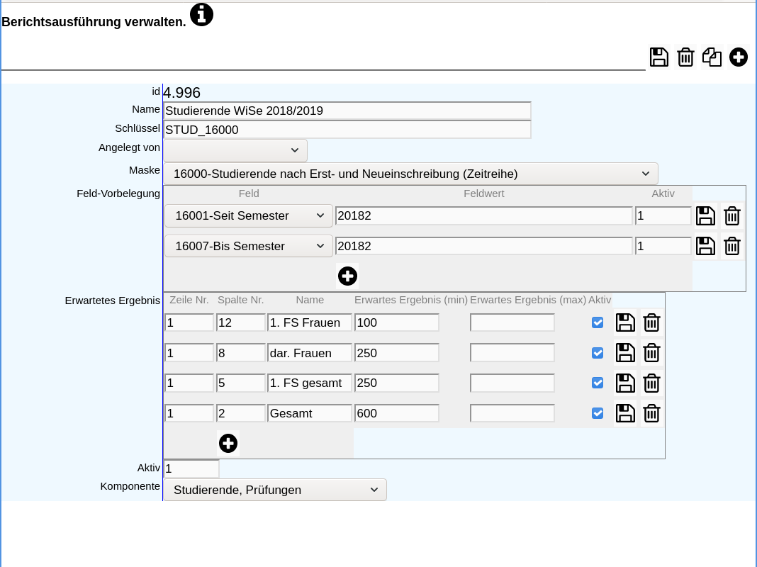 Wir tragen im Bearbeitungsformular zunächst den Namen des Testfalls und die Maske ein, sowie die Komponente. Nach dem Speichern können wir die Unterformulare zu den Feld-Vorbelegungen und zu den erwarteten Ergebnissen füllen. Wir übernehmen die Werte aus der Testfall-Identifikation, d.h. also im WiSe 2018/2019 in Zeile 1 und Spalte 4 den Wert 574. Sie können auch "Toleranzgrenzen" (von-bis) festlegen. Außerdem können Sie mehrere erwartete Ergebnisse hinterlegen, z.B. in Spalte 5 einen weiteren Wert.