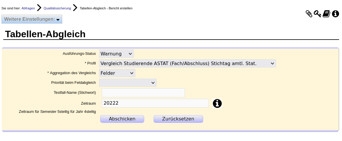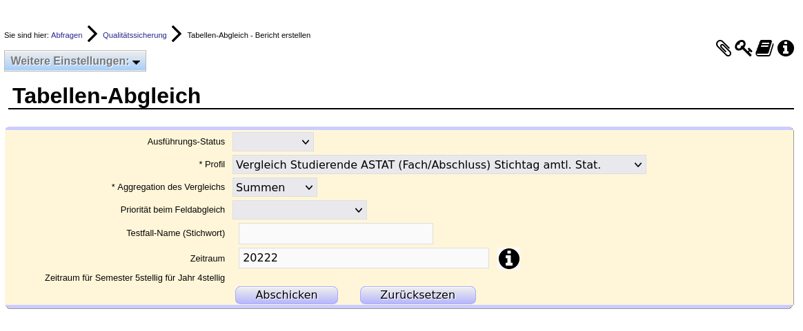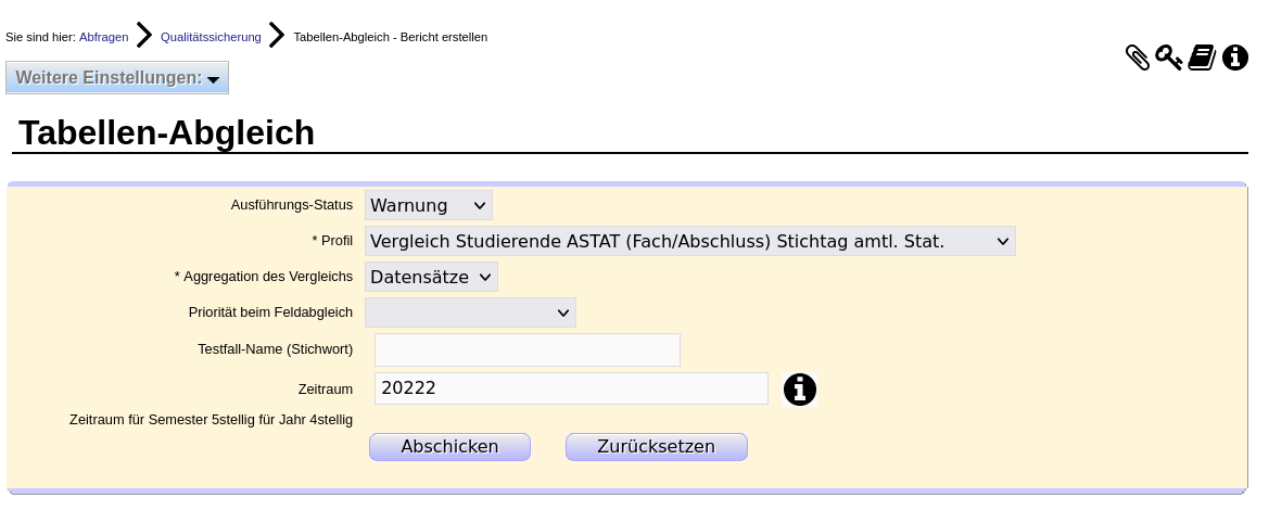 Hier ein Beispiel: Die Maske "Tabellen-Abgleich" bietet ein ausgeliefertes Profil "Vergleich Studierende ASTAT (Fach/Abschluss) Stichtag amtl. Stat.":