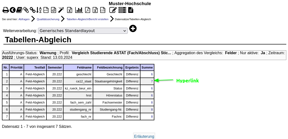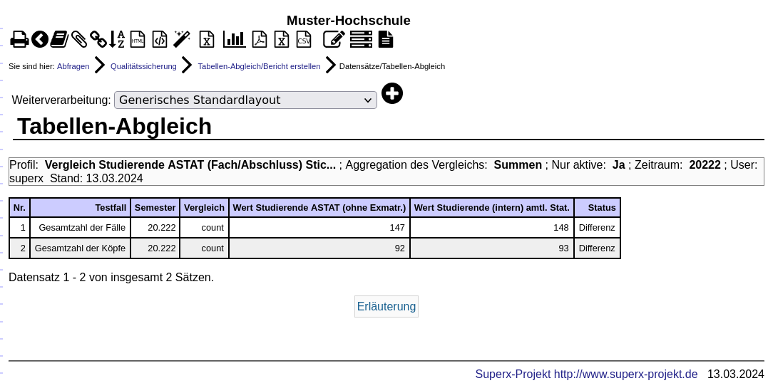 Die Funktion "Tabellen-Abgleich" kann über ein vorgegebenes Profil zwei Tabellen abgleichen Differenzen leicht auffindbar machen. Ein Beispiel ist der Abgleich der Amtl. Studierendenstatistik mit der in SuperX.
