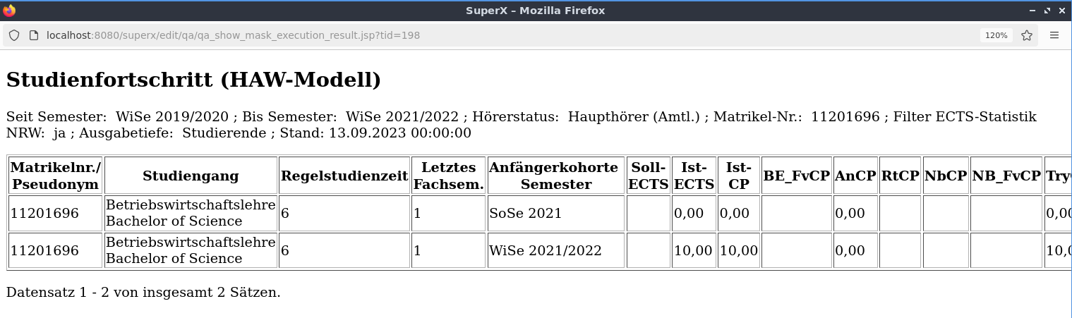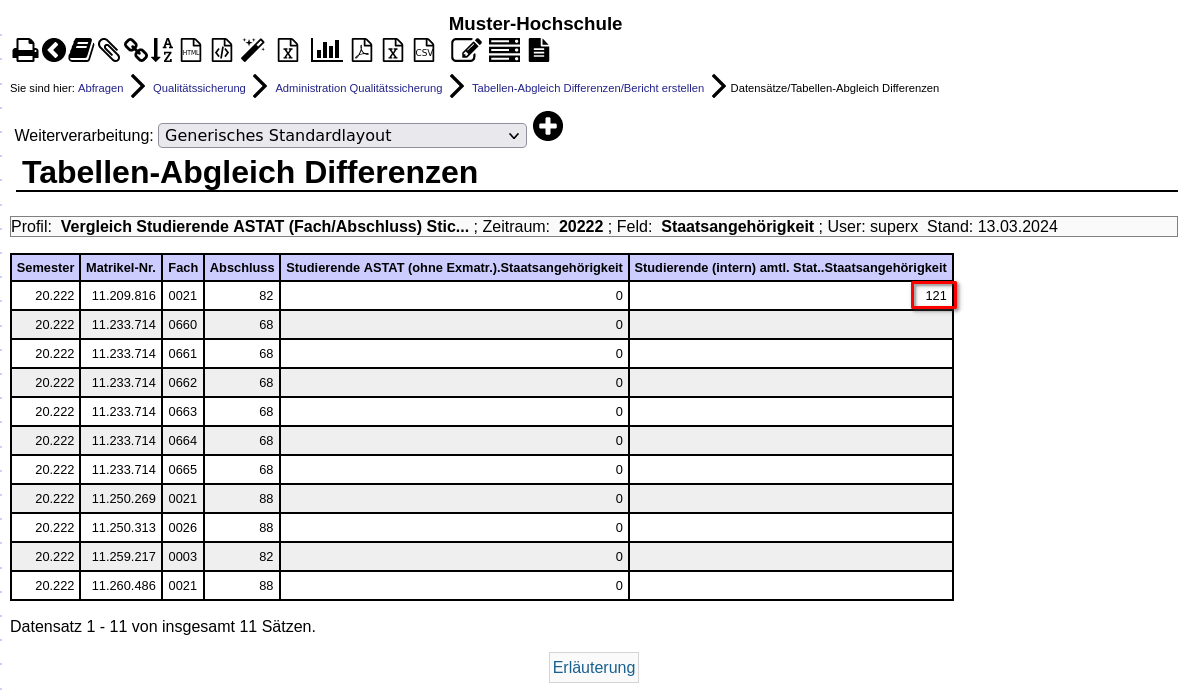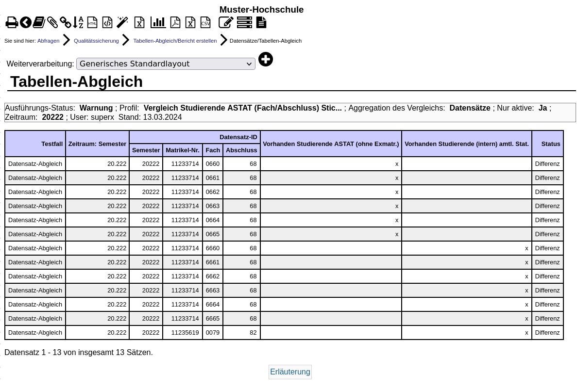 Das Profil gleicht die amtl. Studierendenstatistik mit der Studierendenstatistik im SOS-Modul zum Stichtag "Amtl. Statistik" ab. Gasthörer und Exmatrikulierte werden automatisch ausgeschlossen.
