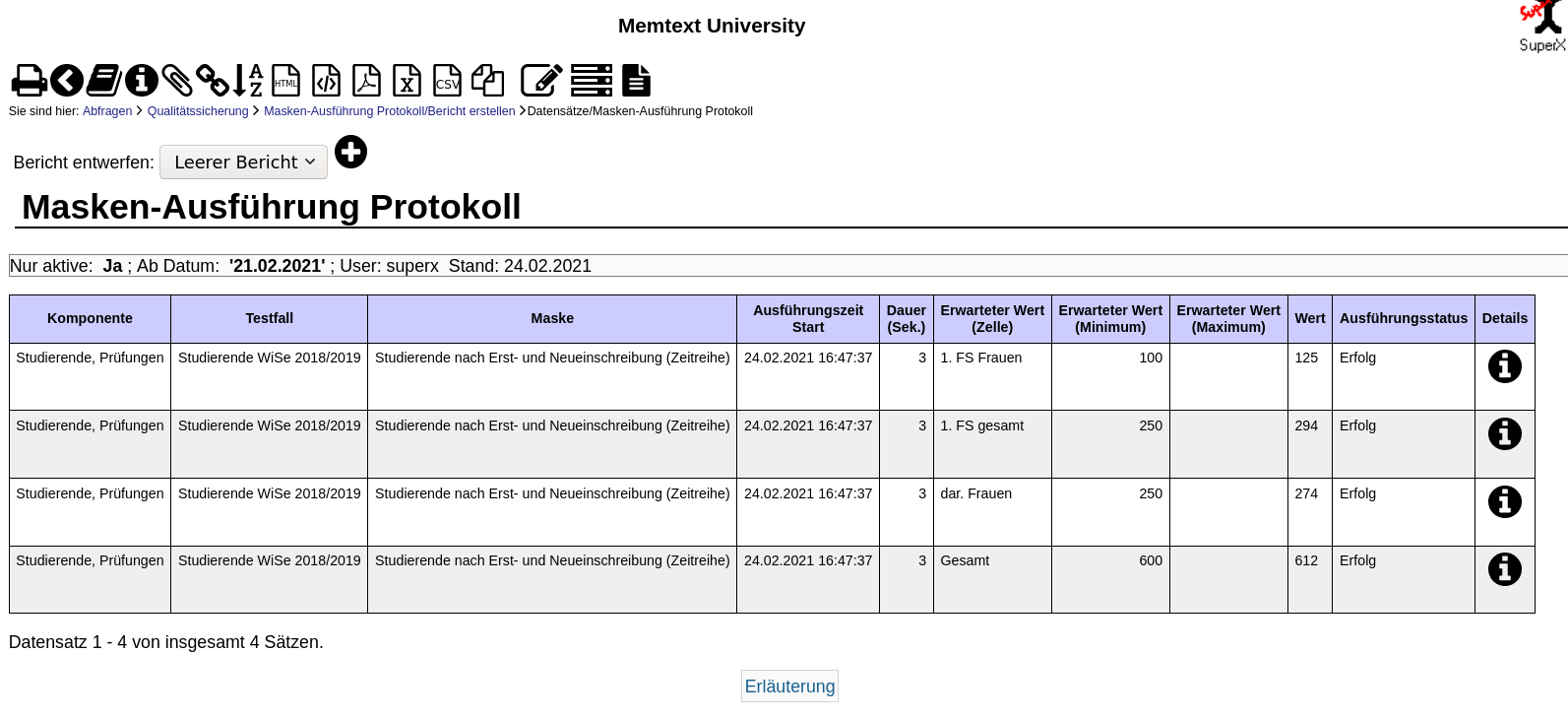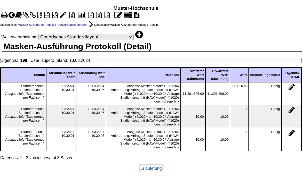 Sie sehen, ob die Maskenausführung erfolgreich war (Spalte Ausführungsstatus), und wie der erwartete und gefundene Wert war. Außerdem sehen Sie die Dauer das Maskenausführung. Die Spalte "Ausführungsstatus" kann drei Werte enthalten: