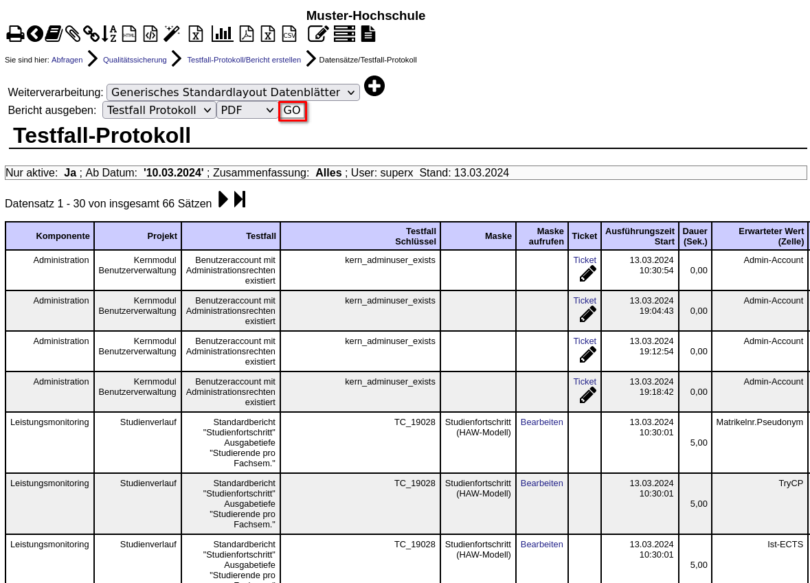 Die Hauptladeroutine des QA-Moduls führt alle als aktiv gekennzeichneten Testfälle aus, normalerweise geschieht dies über Nacht. Nach dem Ausführen können Sie das Protokoll aufrufen. Gehen Sie dazu ins Menü Qualitätssicherung -> Testfall-Protokoll.