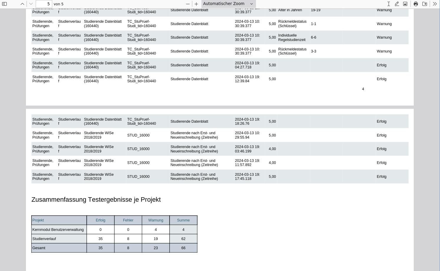 Das Testfall-Protokoll bietet noch einen formatierten Bericht mit einer Kreuztabelle über Projekte und Ausführungsstatus. Sie können diesen im Tabellenkopf aufrufen: