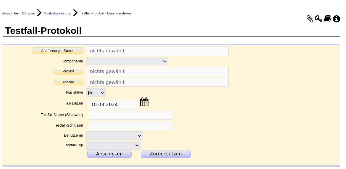 In der Maske können Sie auf einen Start der Ausführung filtern (defaultmäßig heute -3 Tage), sowie nur auf aktiv geplante Testfälle. Außerdem können Sie Testfall-Namen als Stichwort oder Masken, die getestet werden, filtern, oder auf Projekte bzw. Testfall-Typen filtern.