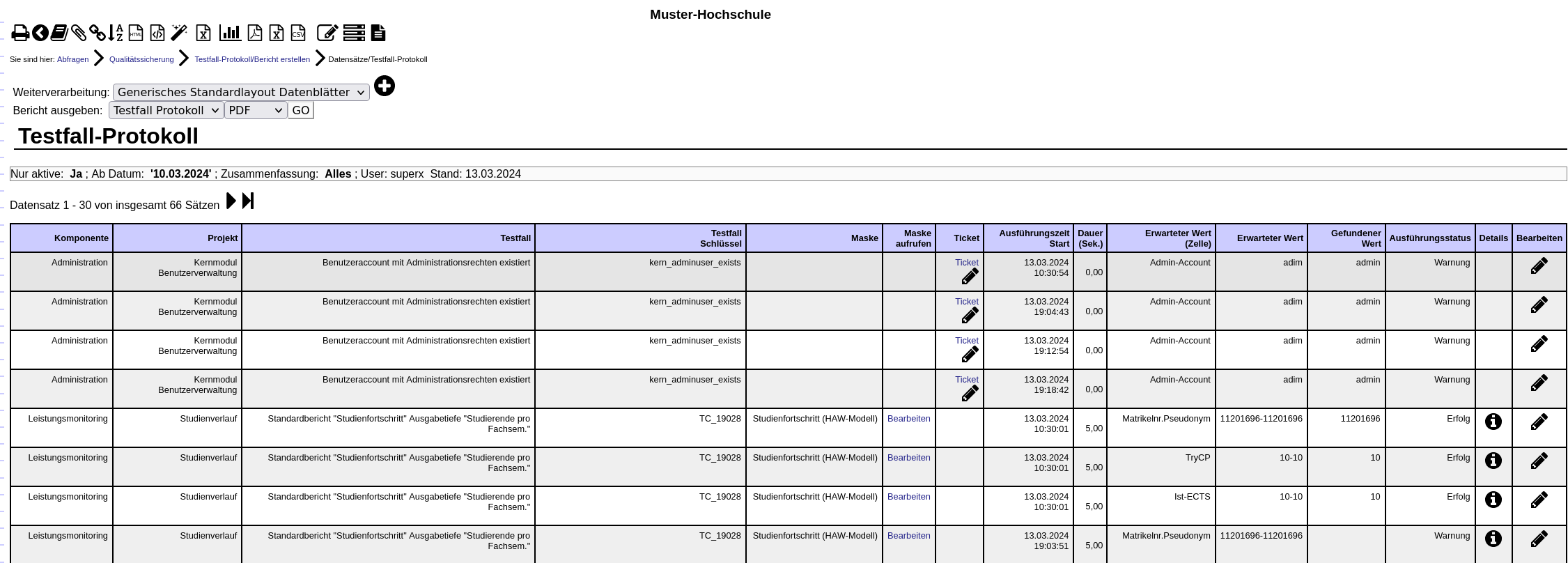 Die Hauptladeroutine des QA-Moduls führt alle als aktiv gekennzeichneten Testfälle aus, normalerweise geschieht dies über Nacht. Nach dem Ausführen können Sie das Protokoll aufrufen. Gehen Sie dazu ins Menü Qualitätssicherung -> Testfall-Protokoll.
